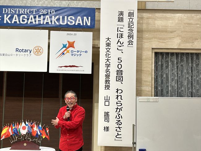 創立記念例会と行いました。ゲストに大東文化大学名誉教授 山口 謠司様をおむかえして、『にほんご、50音図、われらがふるさと』のテーマでお話をいただきました。