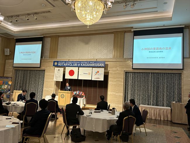 演題は『神話の里霧島と温泉』と題し、温泉発掘作業の様子や霧島のご紹介をいただきました。加賀市も温泉場を抱えており、通鶴部分も多々あったと思います。